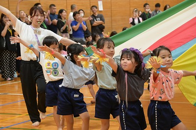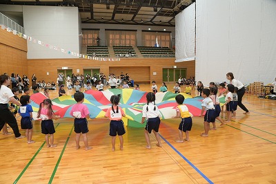 3歳児は忍者になりきって修行に挑戦し、4歳児は心をひとつにしてパラバルーンを楽しみました。